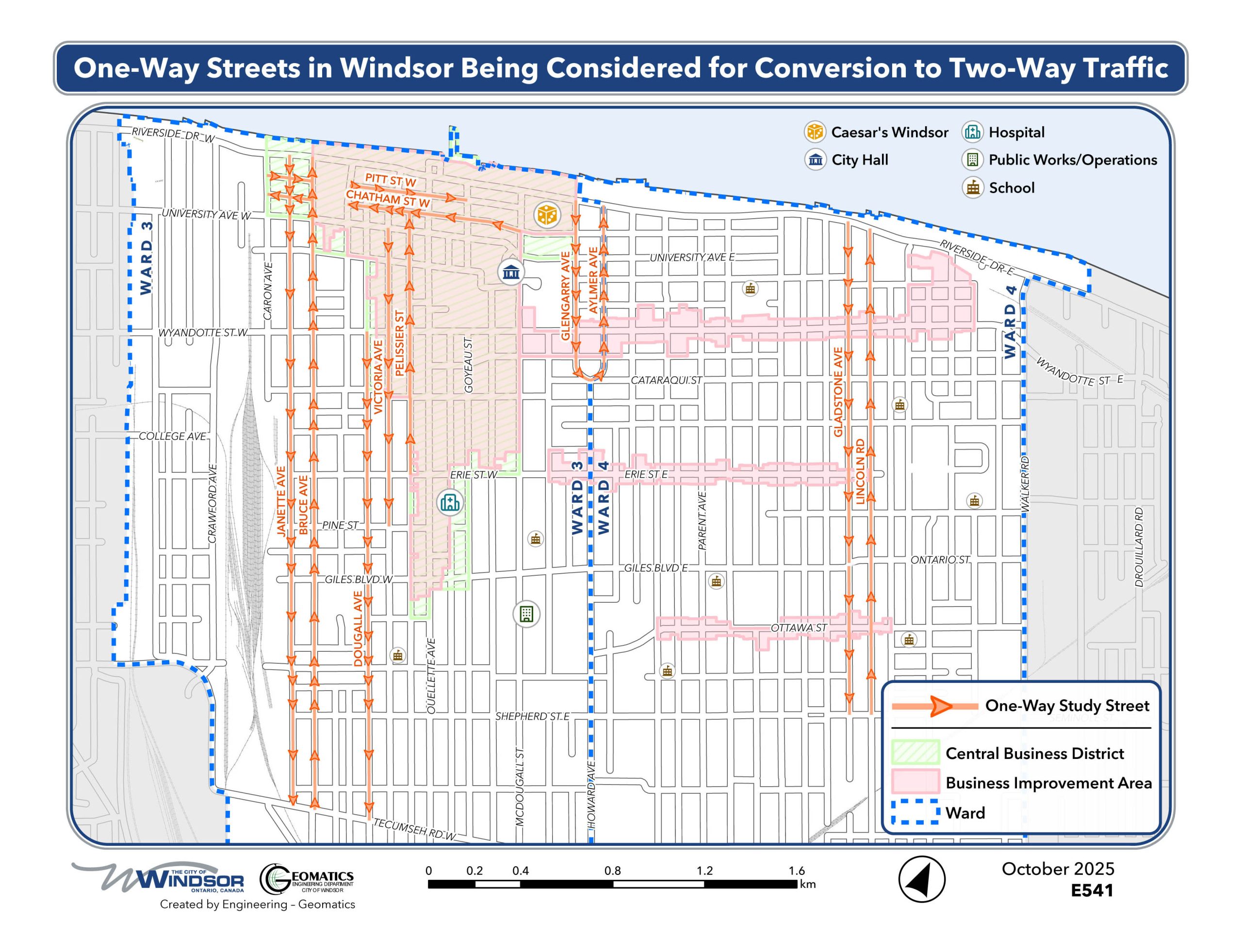 The 2016 Downtown Transportation Strategy aims to to support the City of Windsor Vision of Downtown Windsor as a vibrant and inviting place in which people want to work, play, and shop and have the opportunity to use various modes of active transportation. As part of the strategy, one-way/two-way conversions are discussed with the pros and cons articulated in section 3.4.4: